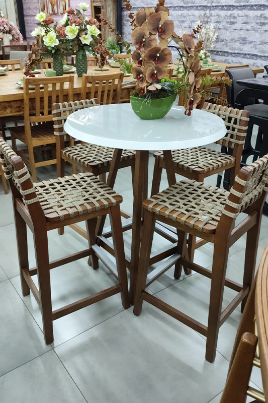 Banqueta Alta em Madeira Maciça c/ Assento e Encosto Trama em Corda Náutica