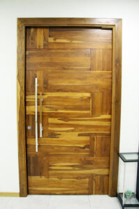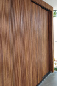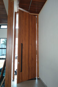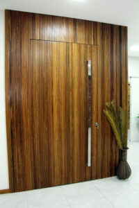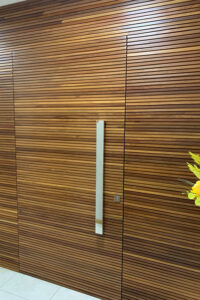 Porta de Entrada Pivotante em madeira Teca Ripado